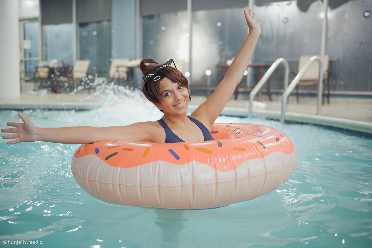 If there's a Danganronpa character who's most like "me," or like me in high school, Asahina is definitely it. Just switch swimming with tennis! I absolutely adored her; she deserves the world. I got the costume pre-made on ebay, but styled the wig myself. I used a base and a ponytail clip. I stuck wire in the ponytail clip as I styled it so that it stays doing that weird duck bill thing. It's so ridiculous lol. It's very heavy, so there's a headband in it and the ponytail clip is connected to it to stay in place. I did a small swimsuit shoot as well with Ani when we were staying at a hotel together. I really want to shoot with a Sakura at some point so I'm holding onto this cosplay for now until that happens, hopefully 😭
