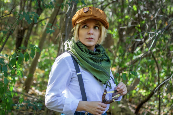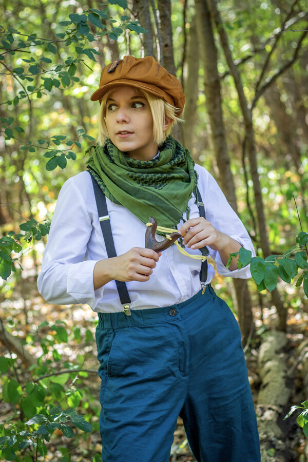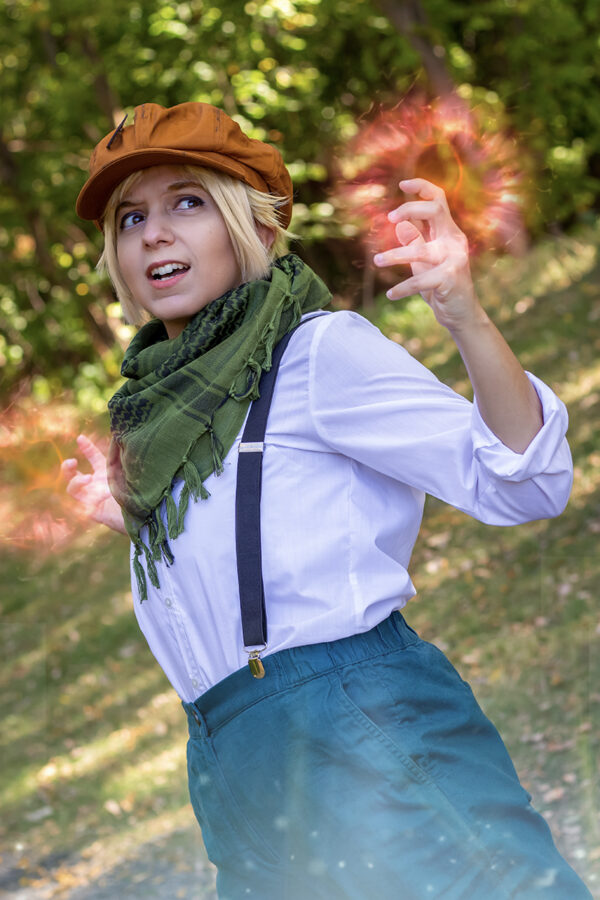 Halley is hands down my favorite character from the first Shadow Hearts game! It's such a shame that he is introduced so late because he's so OP. He pretty much was in my party the rest of the game the second he joins! Not to mention he's also wind element - my favorite element as well! The hat I got came in with the brim sewn to the top which is not how it was advertised; when I seam ripped it apart, it left a hole and so I decided to weather the hat a little and make a little pin of the wind symbol out of foam.