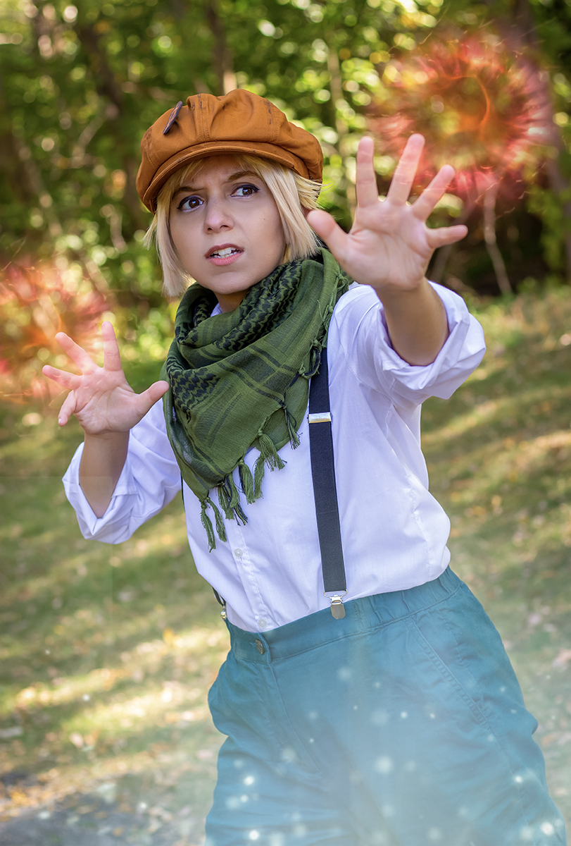 Halley is hands down my favorite character from the first Shadow Hearts game! It's such a shame that he is introduced so late because he's so OP. He pretty much was in my party the rest of the game the second he joins! Not to mention he's also wind element - my favorite element as well! The hat I got came in with the brim sewn to the top which is not how it was advertised; when I seam ripped it apart, it left a hole and so I decided to weather the hat a little and make a little pin of the wind symbol out of foam.